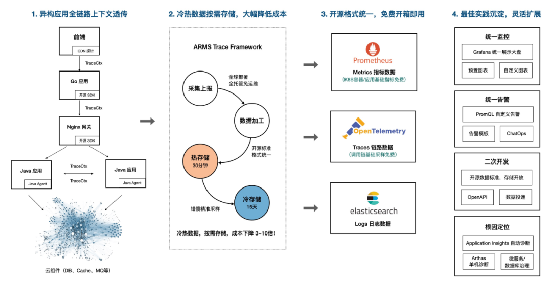 最大化释放多语言产品能力:链路追踪除了最基础的调用链功能外,逐步衍生出了应用/服务监控,方法栈追踪,性能剖析等高阶能力。但是不同语言的成熟度导致产品能力差异较大,比如 Java 探针可以基于 JVMTI 实现很多高阶的边缘侧诊断。优秀的全链路追踪方案会最大化的释放每种语言的差异化技术红利,而不是一味的追求趋同平庸。感兴趣的同学可以阅读之前这篇文章《开源自建/托管与商业化自研 Trace,如何选择》。