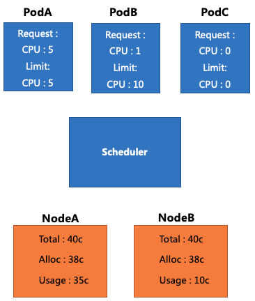 首先,我们来看下图这个示例。图中黄色框代表 2 个 Node,这两个 Node 的 CPU 总数都是 40 核,并且都已经分配了 38 核。其中 NodeA 的真实用量是 35 核,NodeB 的真实用量是 10 核。而蓝色框则代表现在我们还有 3 个待调度的 Pod。