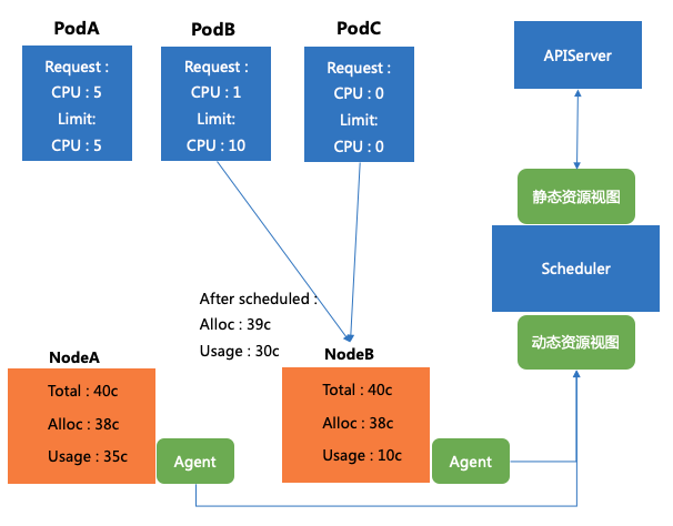 通过添加一个 Agent 去收集单机的资源用量情况,并且汇总计算得到动态的资源视图(机器真实的用量情况),将其上报到调度器,在调度器中配置相关策略,可以将上文中提到的 PodB 和 PodC 准确的调度到 NodeB 上。