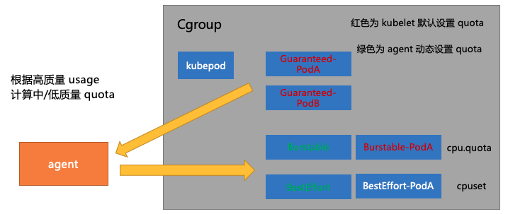 图中红色字体部分(Guaranteed-Pod, Burstable-Pod)的目录由 kubelet 给它们设置 Quota。以 CPU 为例,比如 Limit 填 5,Quota 就会设置为 5。白色字体部分是没有 Quota 限制的( kubepod 和 BestEffort-Pod),可以看到的是 Burstable,BestEffort 这两种 Pod 没有直接挂在 kubepod 目录下,而是自己有一个原本是空白的没有值的二级目录。
