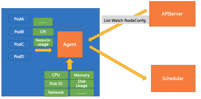 单机 Agent 需要收集两部分资源:Pod 的资源使用情况以及整机的资源使用情况(包括机器内核指标),实时计算实时发生行为同时实时计算上报一份已经算好的数据,可以减轻调度器的计算压力。
