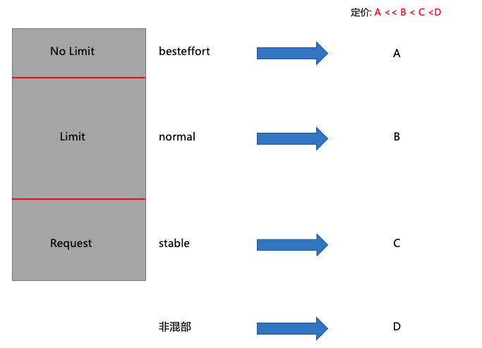 Request 部分,代表是稳定的,安全的,只要申请了就一定可以用到的资源.。 Limit 减去 Request 部分,比如说申请的 Request 是 5,Limit 是 10,中间的 5 核 的差距是相对来说不稳定,但大概率能够得到供给的资源。如果说有需要的时候,系统会尝试把该 Pod 超用的资源压缩回去。 No Limit,就是既不写 Request 也不写 Limit 的部分会尽量保证,但是资源供给 sla 会是一个比较低的数字,用这部分资源就要有随时被杀掉的准备。