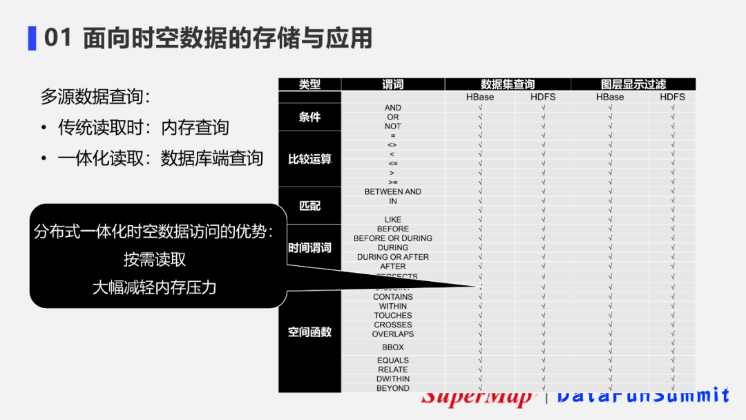 因此,为了更好应对时空数据量剧增所带来的难题,我们需要一种新型的数据存储方法,能够针对超大规模的时空数据,提供存量、流式数据管理的能力,同时保证上层空间数据分析、地图可视化等应用性能,并以简单易用的方式提供时空数据给GIS从业人员使用。本文将和大家分享下超图对于超大规模时空数据的分布式存储与应用方案。主要内容包括:① 面向时空数据的存储与应用;② 面向分布式计算的存储与应用;③ 面向地图渲染的存储与应用;④ 分布式地理处理建模。