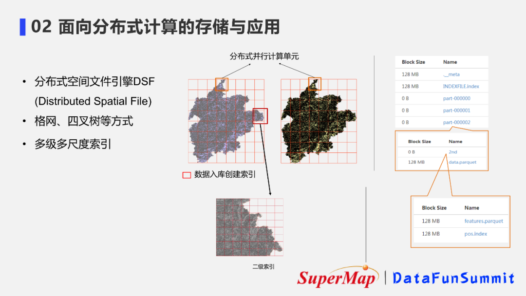 超图推出了一种分布式空间文件引擎,也叫做DSF。这种数据存储方式可以对地理空间数据进行空间索引。通过格网、四叉树等空间索引方式实现对空间单元的划分。划分后的空间单元还可以进行多级多尺度的索引,如对每一个空间单元进一步构建二级索引,以提升精细数据的查询效率。