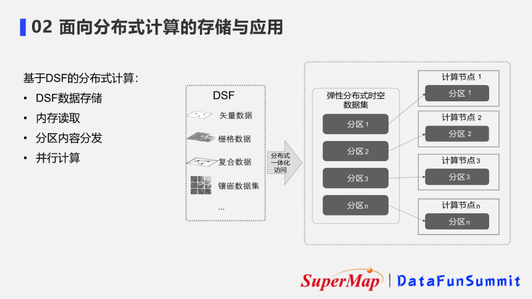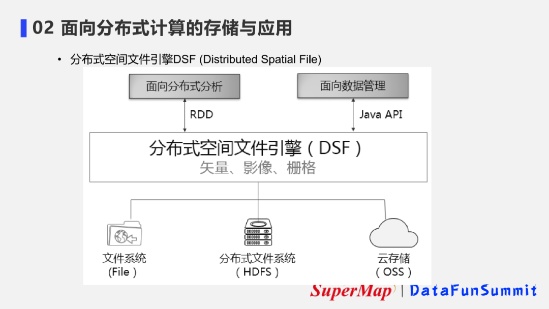 目前,DSF能够完全支持分布式与文件式数据管理方式,也能支持云存储,能够承载矢量、栅格等不同数据类型,以统一的数据结构向上层提供分布式分析与分布式数据管理能力。