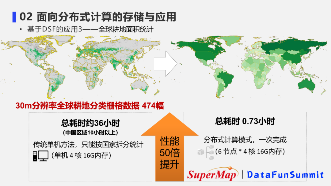 但当尝试使用一个6节点的分布式计算集群,并使用DSF的存储方式进行栅格存储,进行耕地面积统计时,发现一次全球计算只需40min就可以完成。性能提升了50倍,得到了用户的极大肯定。