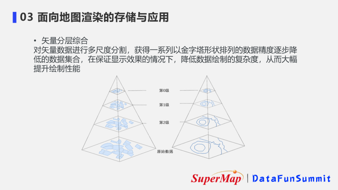 这种存储机制的好处在于对小比例尺级别的层数据可以单独进行数据简化来降低地理数据的复杂程度,从而在地图绘制过程中大幅提升小比例尺下的地图绘制性能。