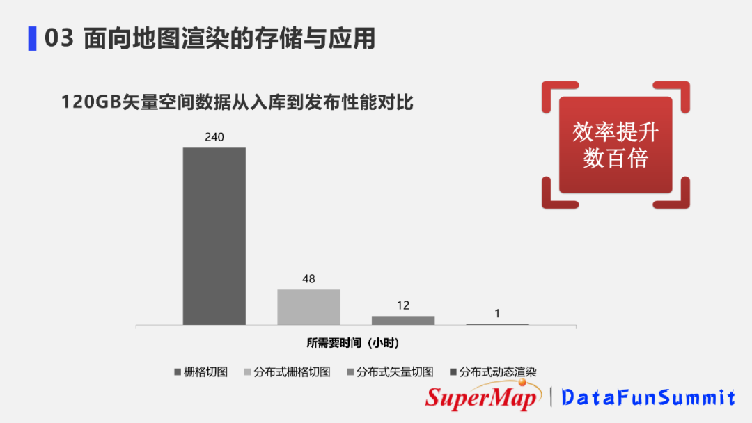 如图所示,这是一个120GB矢量空间数据地图发布性能对比,可以看到传统方法中,仅做个栅格切图就需要240h完成。