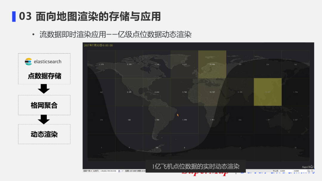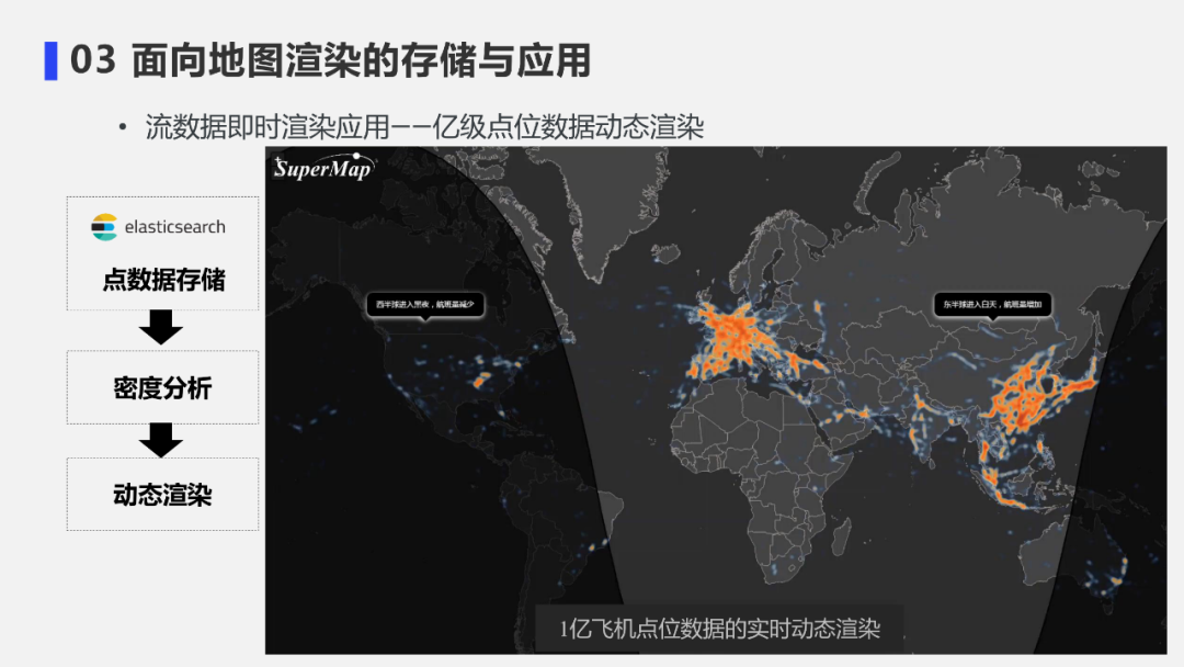 采用了轨迹分析的即时渲染,25亿个飞机点位叠加上轨迹分析结果后能够很清晰的看到各个飞机的行驶轨迹和实时位置。