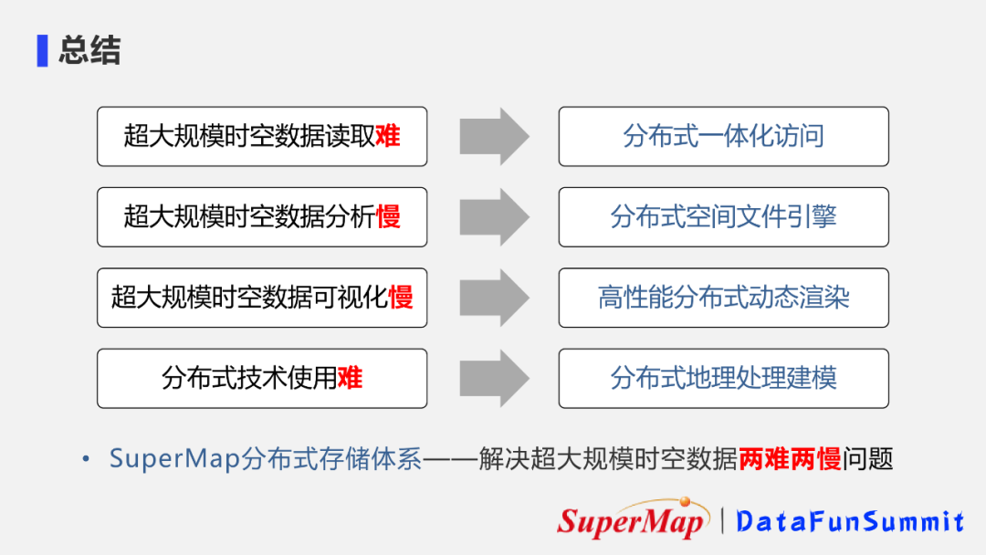 通过分布式一体化访问、分布式空间文件引擎、高性能分布式动态渲染和分布式地理数据建模技术,能够解决超大规模时空数据“两难两慢”的问题。
