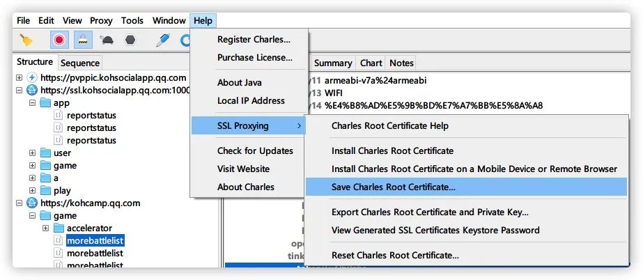 这个工具应该很多人都用过,因为需要抓的接口都是走的Https协议,所以需要把Charles根证书导出来备用,如下图。
