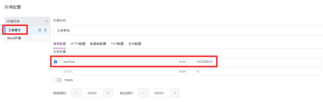 2. 在环境配置中,定义一个全局变量,名称设置为“lastTime”,因为这个分页接口使用的是时间戳作为分页的下标,如下图,值可以随意设置,我们在一开始会重置这个值;
