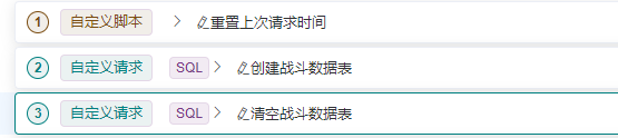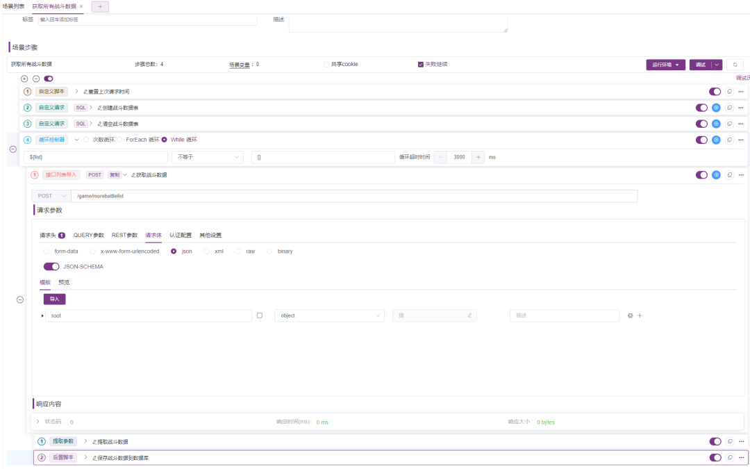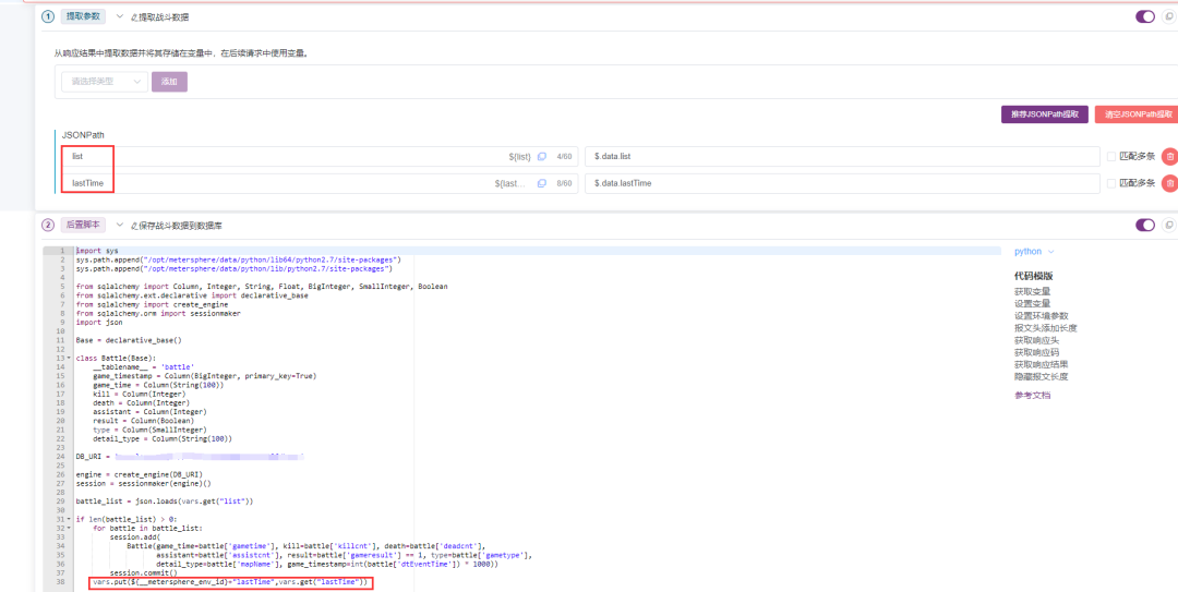 7. 最后,在这个接口下添加两个步骤。先是是参数提取,将战斗记录list和上次请求的lastTime提取出来存到变量中,然后在脚本中将数据处理完成后插入到数据库中,注意脚本最后一句“更新了全局的lastTime变量”。