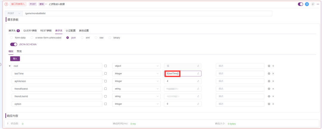 6. 紧接着创建一个接口,地址为 https://kohcamp.qq.com/game/morebattlelist,具体内容如下,注意那个“lastTime”,每次脚本都会修改这个变量;