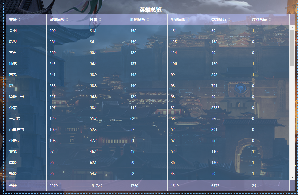 ■ 英雄总览:展示玩家英雄的总体数据,包括胜率、战力、皮肤数量等。
