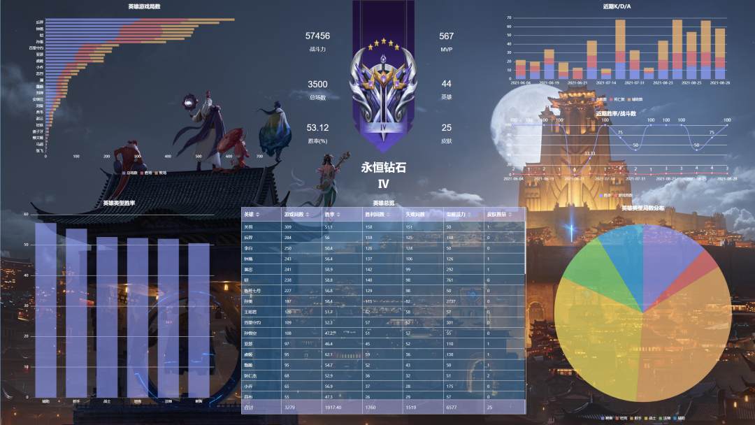关于英雄数据的话,主要可以展示英雄的数量、类型分布还有战斗次数,从这几个数据就能看出玩家大致的技术类型,也就是常说的ADC、上单、打野、辅助、中单。关于战斗数据的话,主要就是展示玩家的战绩了,比如不同英雄类型的胜率、总体胜率、近期K/D/A和近期胜率等。