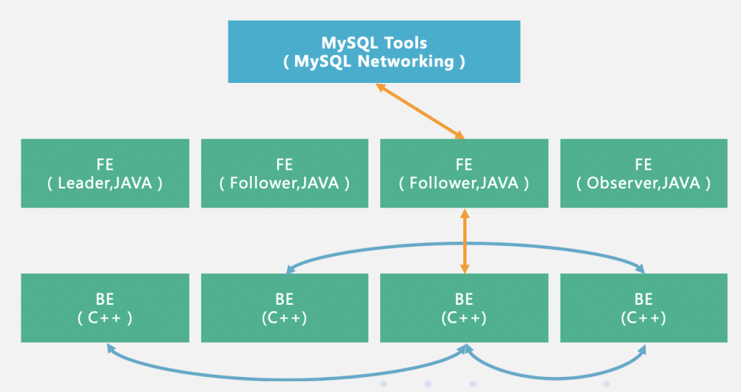如上图,Doris 主要有两类进程:Frontend(FE) 和 Backend(BE) 。