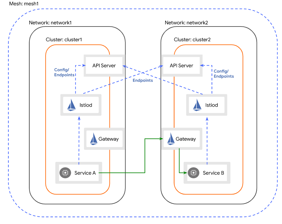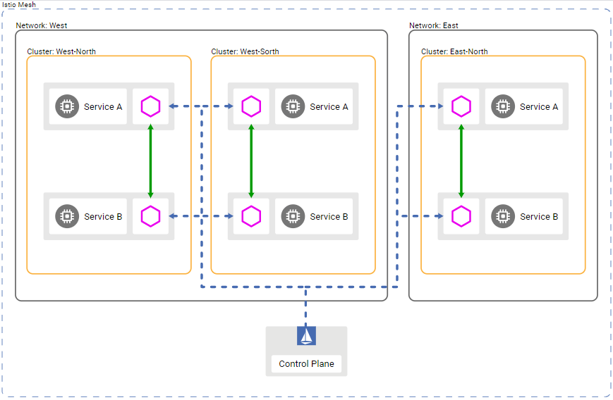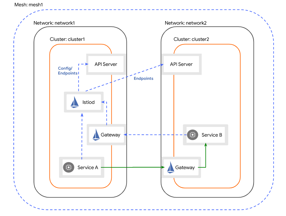 网络可以是多网络,或单网络。有些多的集群也可以几个集群在一个网络,和其他集群不在一个网络。单网络的性能相对比较好一点,因为pod可以直接通信。多网络需要一个东西向网关进行通信,但能对应用进行隔离。