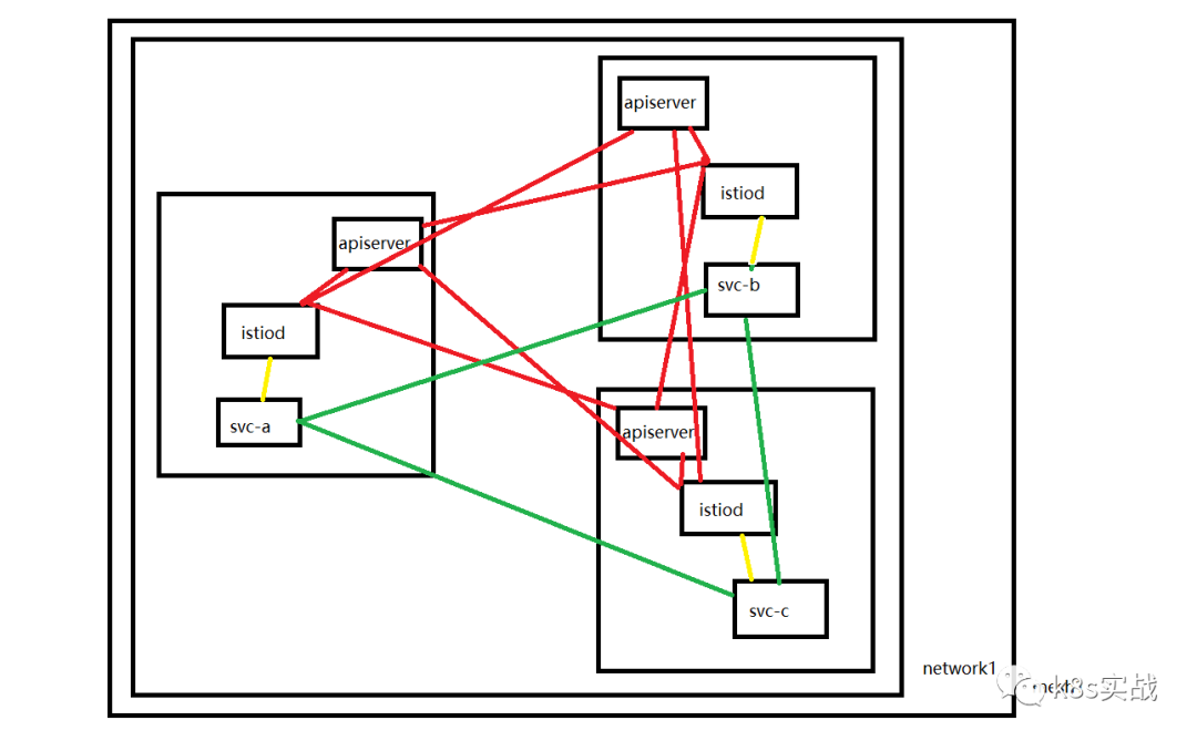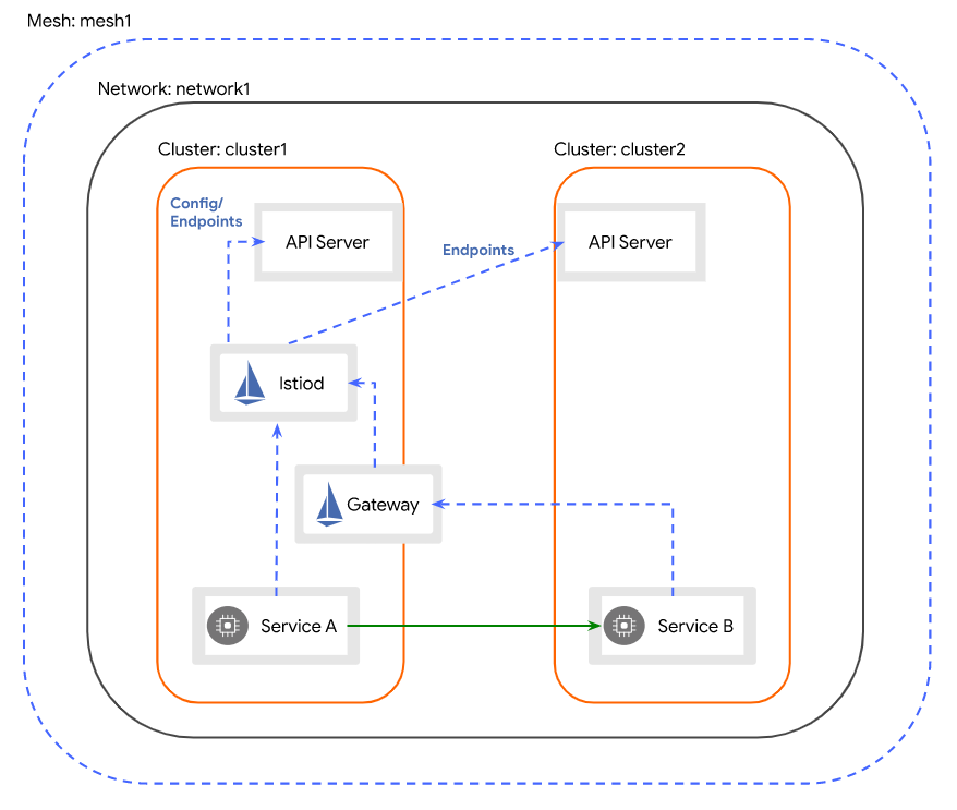 cluster1和cluster2在同一个网络network1,cluster1和cluster2分别有一个istiod,cluster1的istiod监控cluster1和cluster2的apiserver,cluster2的isitod监控cluster1和cluster2的apiserver。cluster1的service链接cluster1的istiod,cluster2的service连的试cluster2的istiod。cluster1的service和cluster2的service直接链接。