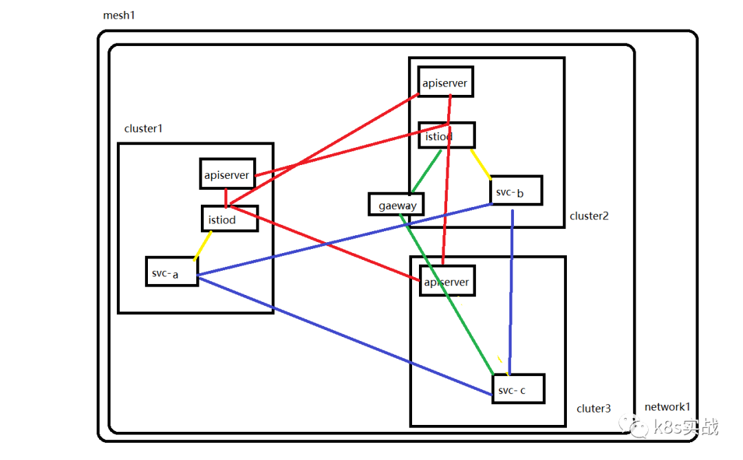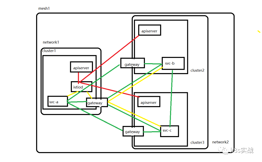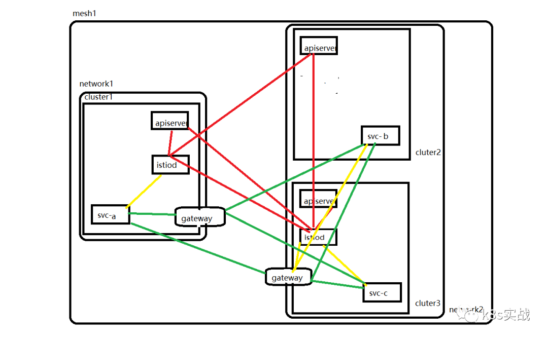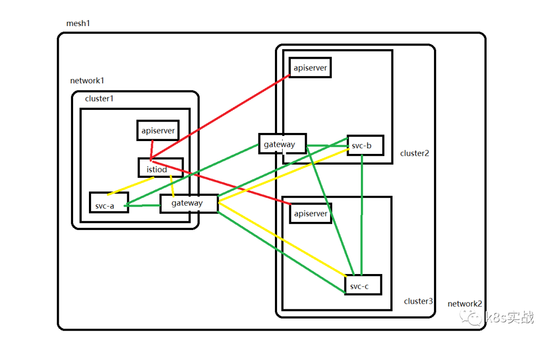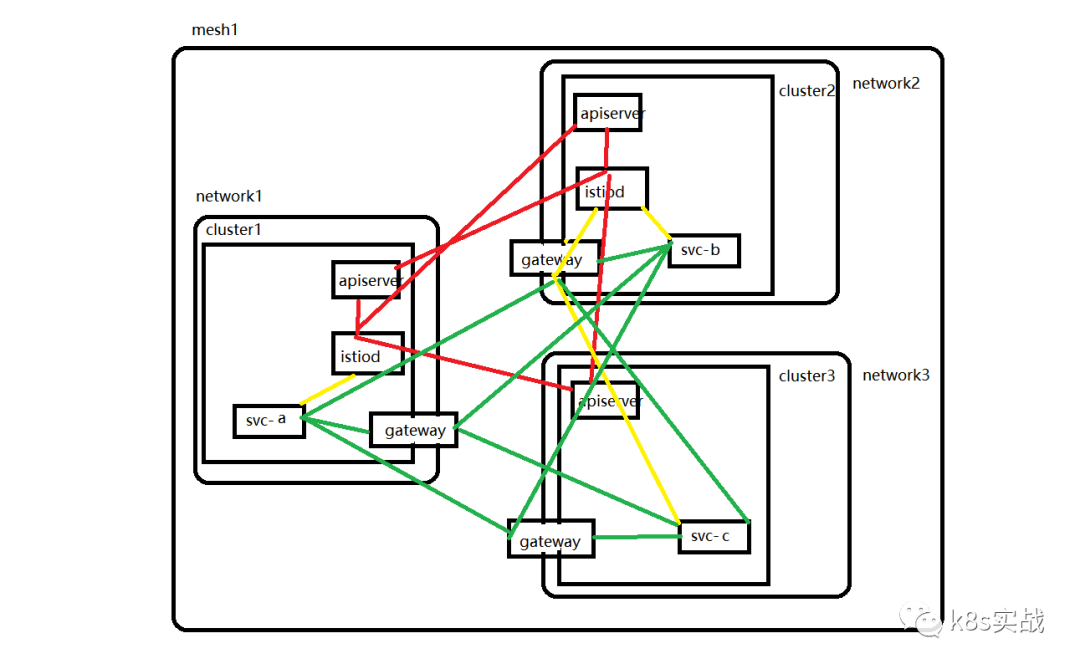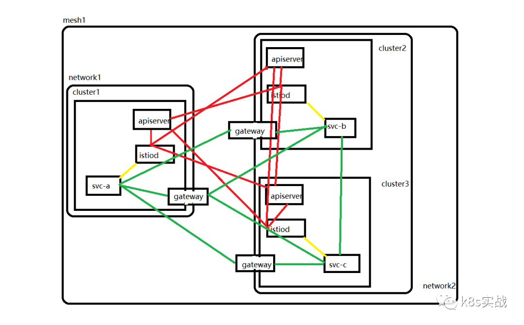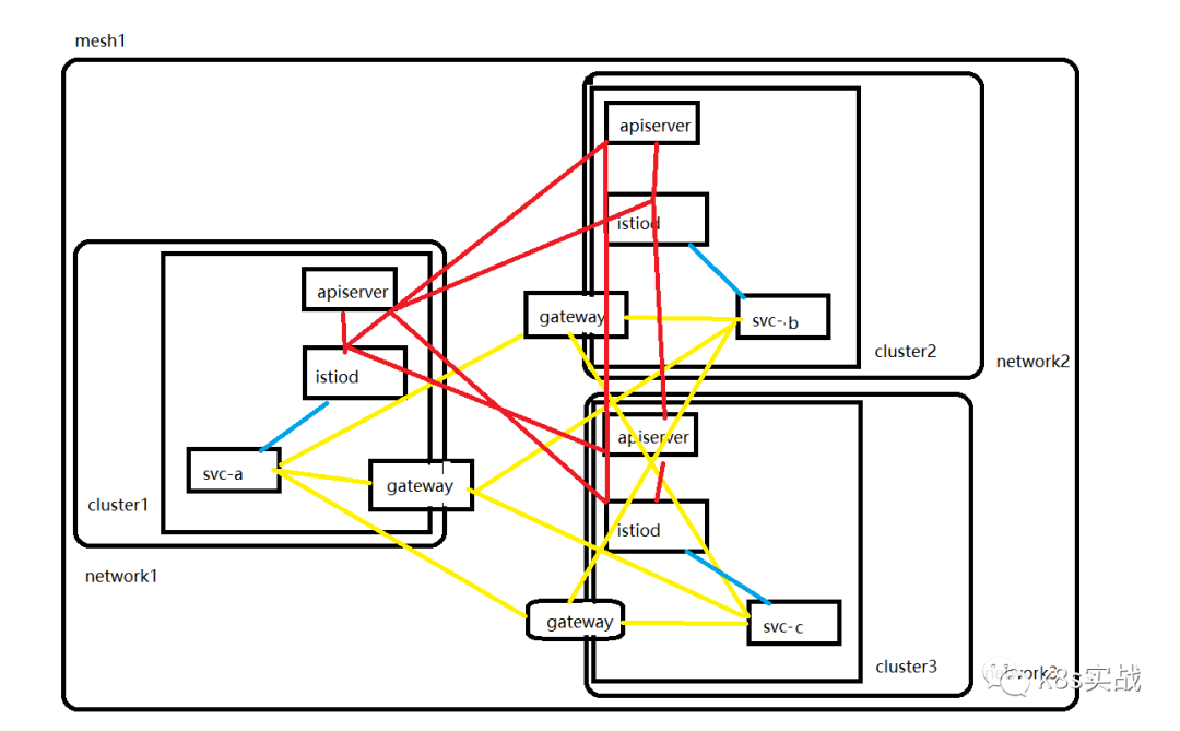 cluster1在network1,cluster2和cluster3在同一个网络network2.cluster1有一个istiod,cluster3有一个istiod,cluster2用cluster3的istio。istiod监控所有集群apiserver。cluster1的service和cluster2的servcie的proxy直接链接istiod,cluster2的proxy通过cluster3的东西向网关连接cluster3的itiod。cluster1的service通过cluster3的东西向网关连接cluster2和cluster3的service。cluster2和cluster3的service通过cluster1的东西向网关连接cluster1的service。