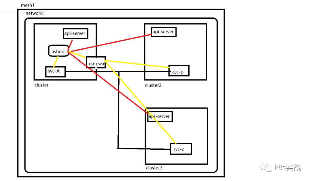 cluster2和cluster3在一个网络中,他们和cluster1不在一个网络中。各自集群有各自的istiod。集群内的proxy连接的是自己集群的istiod。cluster2和cluster3的service可以直接通信,他们和cluster1的service通过cluster1的东西向网关通信。