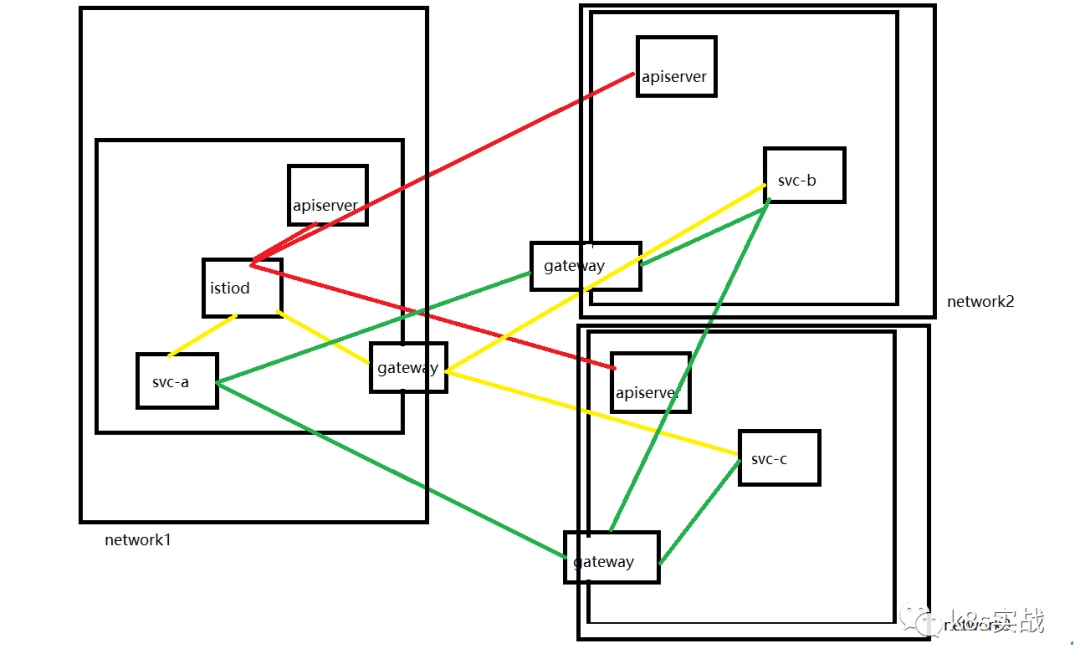 三个集群网络都是隔离的,每个集群都有各自的istiod和东西向网关。每个集群的service要访问其他集群的服务,都必须通过对象集群的东西向网关。每个集群的proxy连接到自己集群的istiod。istiod监控所有集群apiserver。