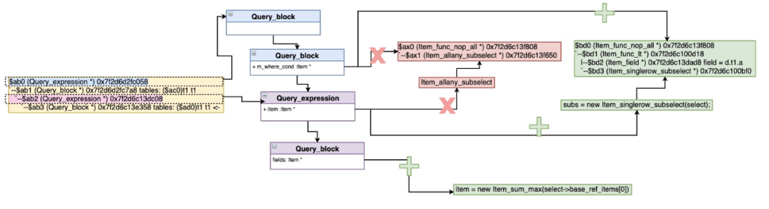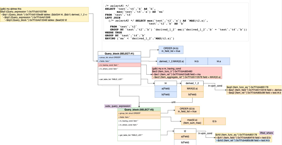还需要添加所有引用到这些Item的fields,包括直接在SELECT列表的,Window函数参数、ORDER by、Partition by包含的,还有该查询块中ORDER BY的列,因为他们都会引动到Derived Table里。 创建Derived Table需要的Query_expression/Query_block(create_query_expr_and_block)。 添加Derived Table到查询块和top_join_list中。 保留旧的子查询单元块,如果包含可以转化的Derived的移到Derived Table下面的Query_block,如果不包含,保留到原来的子查询块中。 将之前的聚合函数Item列表插入到Derived Table的查询块中。 收集除GROUP AGG表达式中的列,由于这些fields已经移动到Derived Table中,删除不合理的fields引用。 收集所有唯一的列和View的引用后,将他们加到新的Derived Table列表中。 对新的新的Derived Table进行flatten_subqueries/setup_tables 重新resolve_placeholder_tables,不处理进行转换后的子查询。 处理Derived Table中,新加入的HAVING条件中的聚合函数Item,并通过Item_aggregate_refs引用到new_derived->base_ref_items而不是之前的父查询块base_ref_items。 永久代替父查询块中的聚合函数列表,变成Derived Table的列,并删除他们。 之前保存和加入到Derived Table的唯一的列和View的引用,也要替换新的fields代替他们的引用。