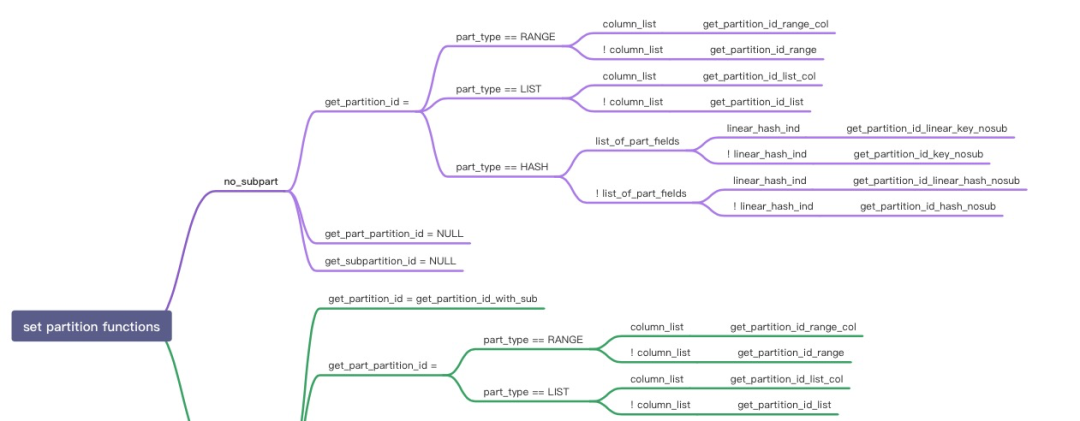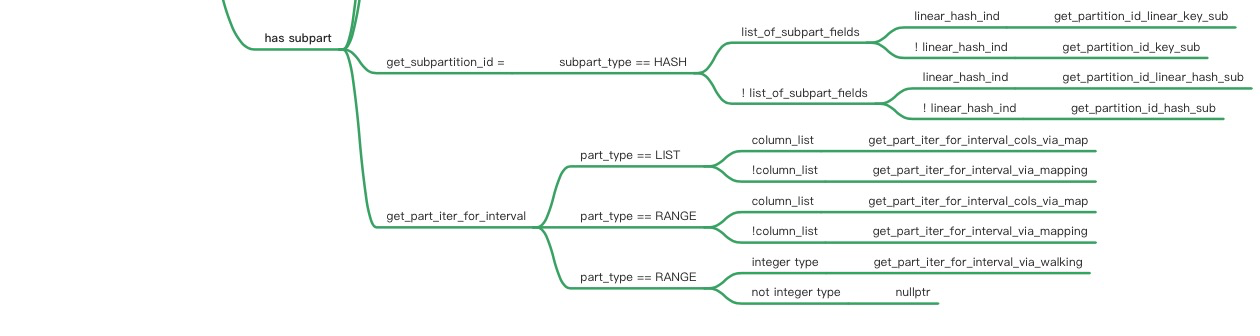 (start)| $| Partitioning keyparts $ subpartitioning keyparts| $| ... ... $| | | $| +---------+ +---------+ $ +-----------+ +-----------+\-| par1=c1 |--| par2=c2 |-----| subpar1=c3|--| subpar2=c5|+---------+ +---------+ $ +-----------+ +-----------+| $ | || $ | +-----------+| $ | | subpar2=c6|| $ | +-----------+| $ || $ +-----------+ +-----------+| $ | subpar1=c4|--| subpar2=c8|| $ +-----------+ +-----------+| $| $+---------+ $ +------------+ +------------+| par1=c2 |------------------| subpar1=c10|--| subpar2=c12|+---------+ $ +------------+ +------------+| $... $例如第一行(par1=c1 and par2=c2 and subpar1=c3 and subpar2=c5)的遍历的stack将是:in find_used_partitions(key_tree = "subpar2=c5") (***)in find_used_partitions(key_tree = "subpar1=c3")in find_used_partitions(key_tree = "par2=c2") (**)in find_used_partitions(key_tree = "par1=c1")in prune_partitions(...)然后是继续下面的条件,以此类推or(par1=c1 and par2=c2 and subpar1=c3 and subpar2=c6)or(par1=c1 and par2=c2 and subpar1=c4 and subpar2=c8)or(par1=c2 and subpar1=c10 and subpar2=c12)