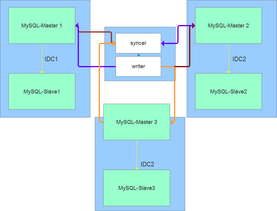 我们先来看下之前的一个简略版设计,这是基于分布式设计方案,可以引入数据组件syncer和writer,实现机房多活的业务需求,syncer和writer为数据的发布者和消费者,基于分布式协议进行处理。