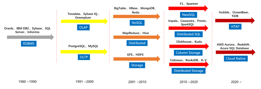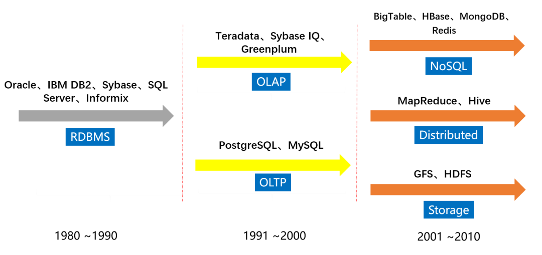 1990年至2000年,开源数据库开始展露头角,出现了PostgreSQL和MySQL等。与此同时,出现了一些分析型数据库,因为之前出现的都是OLTP数据库。随着大数据的出现,需要对数据进行分析,为了避免读写冲突,就需要建立专门的分析型数据库系统,因此出现了OLAP。例如:Teradata、Sybase IQ、Greenplum等就快速成长起来。