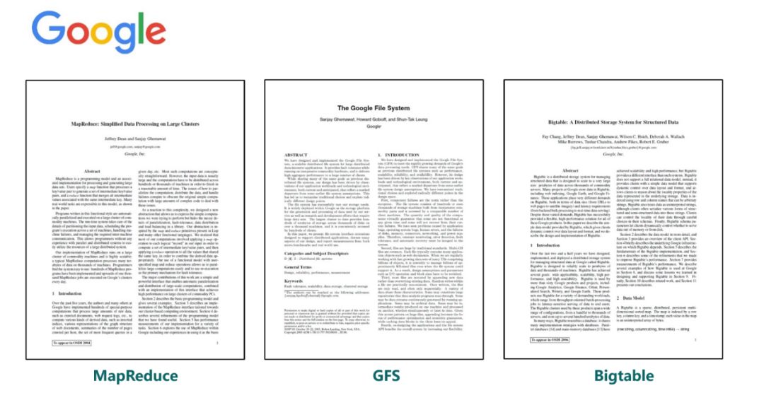 2000年到2010年期间,以谷歌为代表的互联网公司逐渐推出了面向BigData的数据库计算框架及存储系统也就是所谓的谷歌GFS(Google File System)、Google Bigtable、Google MapReduce ——“三大技术”。Google File System解决了分布式文件系统问题,Google Bigtable解决了分布式KV(Key-Value)存储的问题,Google MapReduce解决了在分布式文件系统和分布式KV存储上面如何做分布式计算和分析的问题。