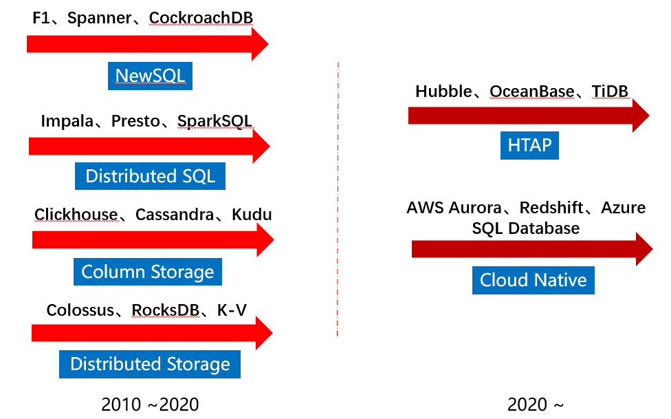 于是这10年也很快度过,我们于是见证了像Google、Amazon、阿里巴巴这些云计算厂商成了这个时期数据库发展的主要源动力。给我们创造了主要的核心数据库新技术,推动我们继续不断向前。