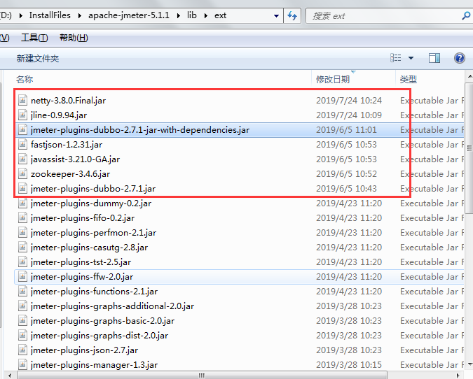 第二种是不带依赖包的版本,例如jmeter-plugins-dubbo-2.7.1.jar。然后获取以下依赖包,将它们放到jmeter安装目录下的lib/ext。如果是项目中使用报错,或者dubbo版本不是2.X版本的,建议下载这个
