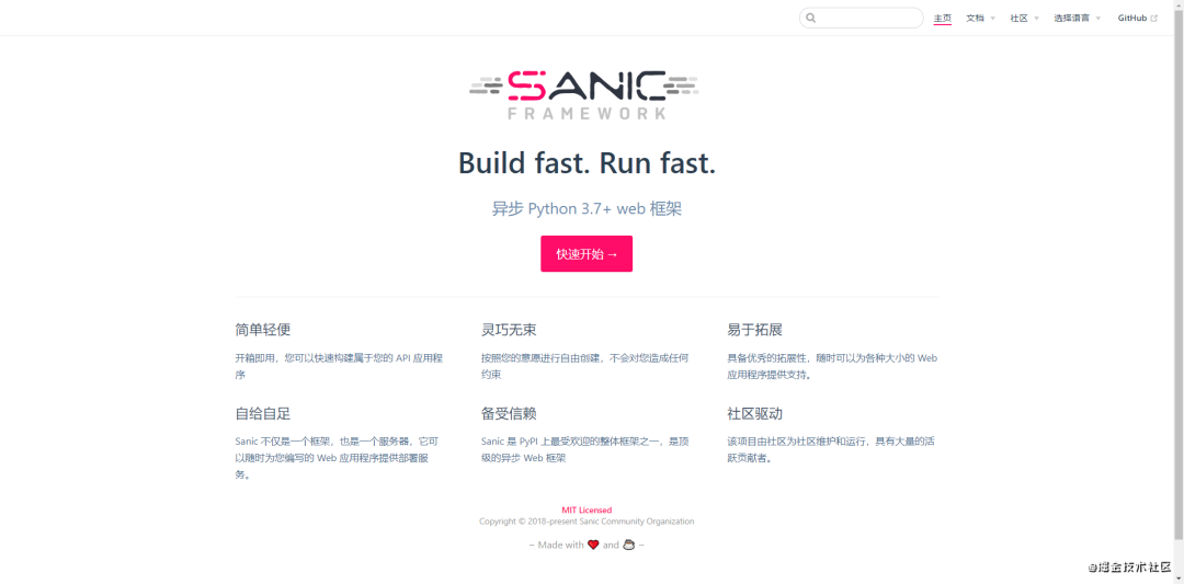 但 Sanic 拥有完善的中文用户指南和 API 文档,这些都是由贡献者自主发起的,官方承认的文档,由翻译者进行翻译贡献,由 Sanic 官方团队进行发布。或许有的小伙伴会说 Flask 也有完善的中文文档,但是那是在不同的站点上的,Sanic 的所有文档都有 Sanic 官方进行发布支持。且目前 Sanic 还在持续支持 韩语、葡萄牙语等更多的语种。