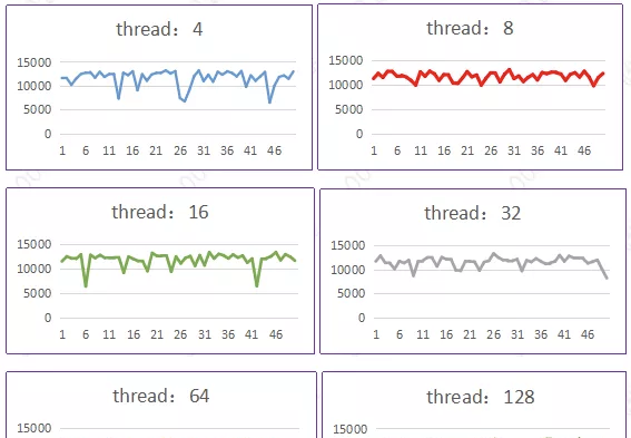 2、参数-t(--thread,线程数)与操作系统cpu核数有关,-t不宜设置过大,过大的线程数设置反而会因线程调度反而使性能降低。如下图所示,操作系统为8核cpu:相同连接数和测试时长条件下,不同线程数对同一系统REST接口测试,从测试结果可以看出当thread=8(与cpu核数一致)时系统性能测试结果最佳,性能波动最小;