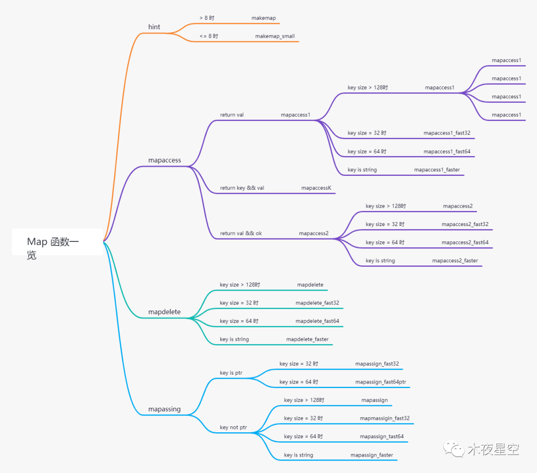 主要分为三个操作:mapaccess 访问、mapassign 赋值 和 mapdelete 删除。mapaccess 和 mapassign 的原理和操作其实都差不多,具体流程如下: