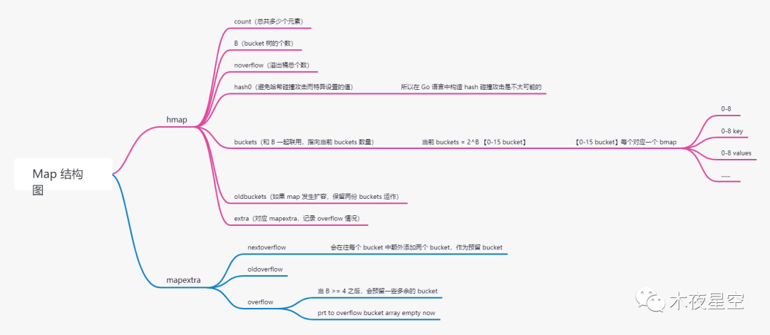 当我们写了一个 map 数据结构,其实底层对应的是 hamp 这个结构。在 hmap 中,关键的字段可以从图中看到