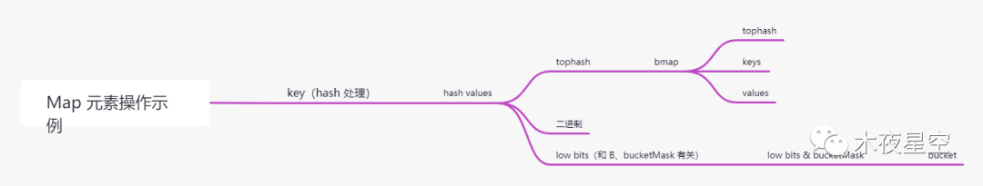 想要访问一个 map 元素,先对一个 key 做 hash。比如有个 hash values 值是 64 位。这 64 位可以大概分成三部分:开头前八位我们叫做 tophash、最后几位我们叫做 low bits。而这个 low bits 其实是跟 bucket 大小相关的,比如我们 bucket 的大小是 2 的 5次方 32,那么 low bits 就会对 5 做与运算。