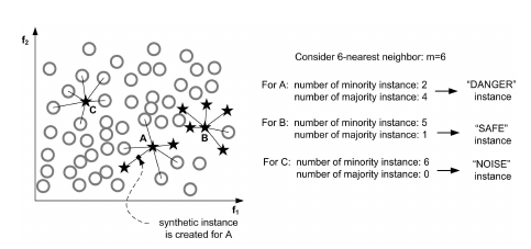 “noise” instance:所有的 kNN 样本都属于多数类; “danger” instance:超过一半的 kNN 样本属于多数类; “safe” instance:超过一半的 kNN 样本属于少数类;