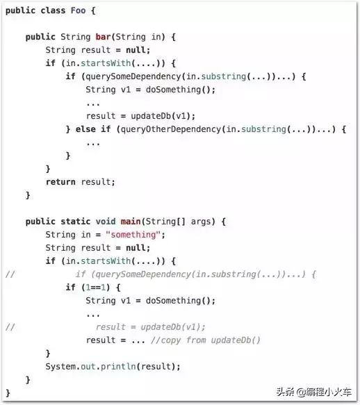 为了对付这种情况,一个显而易见的方法是把目标代码copy一份到调试代码处,修改依赖相关的部分。比如下图就演示了一段代码,需要根据外部依赖判断执行某操作,并更新数据库。为了测试执行操作的逻辑,开发者copy了代码,注释掉与环境相关的代码。
