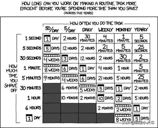 这张表是值得花多少时间把某项工作自动化,比如左上角第一表格表示,一个需要一秒的操作,如果在未来5年每天执行50次,那么花1天时间自动化它是值得的。