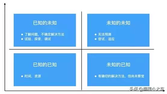 以上图为例,一般想到的测试,都集中在“已知的未知”这个象限。正如前面的示例代码,使用不熟悉的库带来未知。程序员通过在测试中调用和观察结果来消除未知。