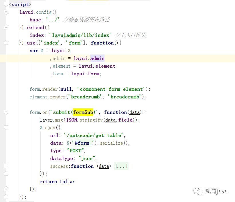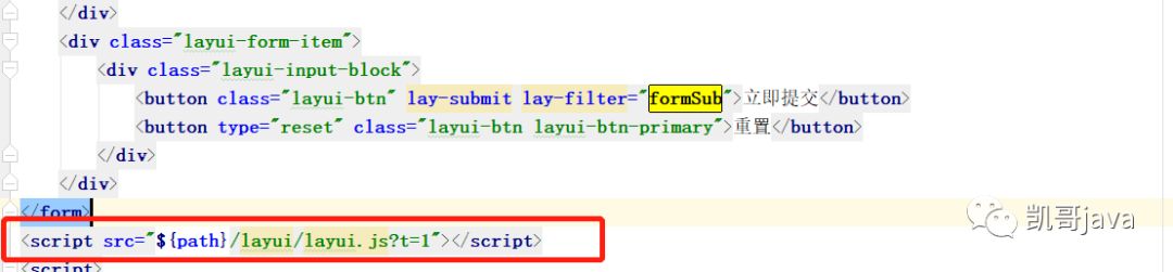 这里的form.on('submit(formSub)', function(data)里面submit(提交按钮lay-filter的值)