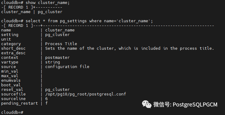 为不同目的设置标识这个数据库集群(实例)的名称。此集群名称出现在该集群中所有服务器进程的进程标题中。此外,它还是备用连接的默认应用名称。(参见