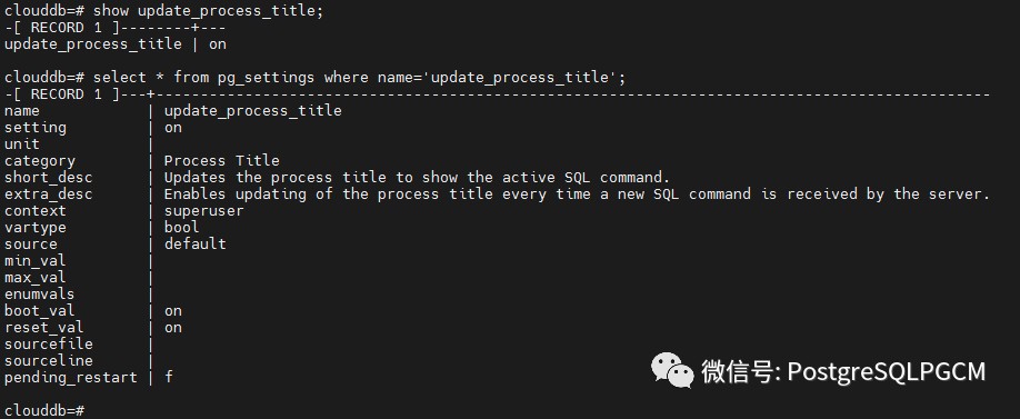 启用进程标题更新,每次服务器接收到一个新的 SQL 命令时都更新进程标题。在大部分平台上这个设置默认为on,但是由于 Windows 上更新进程标题的开销更大,所以在Windows 这个设置默认为off。只有超级用户能更改这个设置。