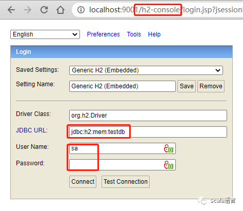 由于我们在application.yaml中配置了H2的控制台,因此我们可以通过浏览器连接数据库。在地址栏中输入http://localhost:9001/h2-console就可以进入H2数据的控制台。