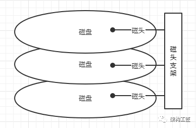 一个磁盘由大小相同且同轴的圆形盘片组成,磁盘可以转动(各个磁盘必须同步转动)。在磁盘的一侧有磁头支架,磁头支架固定了一组磁头,每个磁头负责存取一个磁盘的内容。磁头不能转动,但是可以沿磁盘半径方向运动(实际是斜切向运动),每个磁头同一时刻也必须是同轴的,即从正上方向下看,所有磁头任何时候都是重叠的(不过目前已经有多磁头独立技术,可不受此限制)