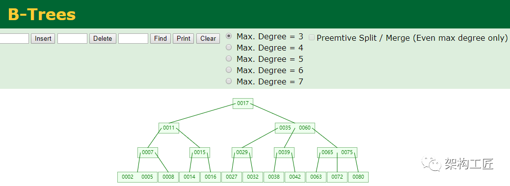 概念都是比较枯燥乏味的,我们还是结合图片,这样更形象生动,易于理解,我们准备一个3阶的B-Tree图,数据包含:2,5,7,8,11,14,15,16,17,27,29,32,35,38,39,42,60,63,65,72,75,80