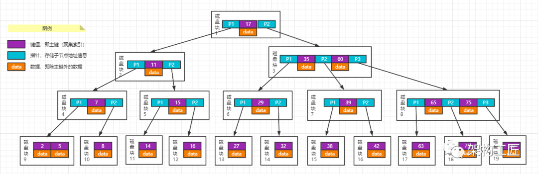 每个节点占用一个盘块的磁盘空间,因为是3阶B-Tree,所以一个节点上有一到两个升序排序的关键字和三个指向子树根节点的指针(P1,P2,P3),指针存储的是子节点所在磁盘块的地址。两个关键词划分成的三个范围域对应三个指针指向的子树的数据的范围域。以根节点为例,关键字为17,P1指针指向的子树的数据范围为小于17,P2指针指向的子树的数据范围为大于17。