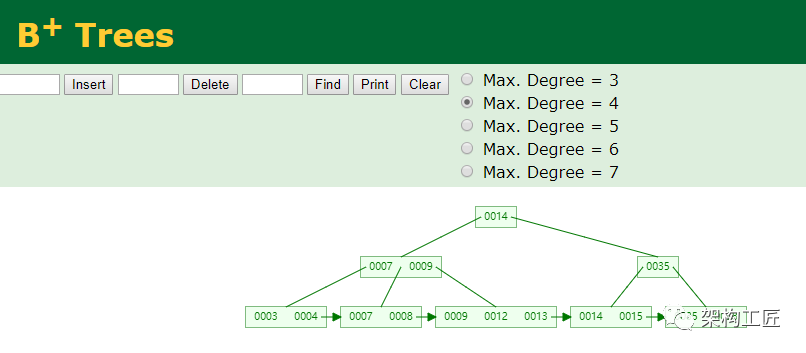 由上图我们可以看到B-Tree的每个节点中都包含Key对应的Data数据,而之前提到过每个磁盘块的大小是固定的,MySQL中页的大小默认配置只有16K,假如每一个节点Key对应的Data数据都很大的时候,可以想象16K很快就满了,进而导致B-Tree的深度较大,增大查询时的磁盘I/O次数,进而影响查询效率,显示这种也不是很优雅。